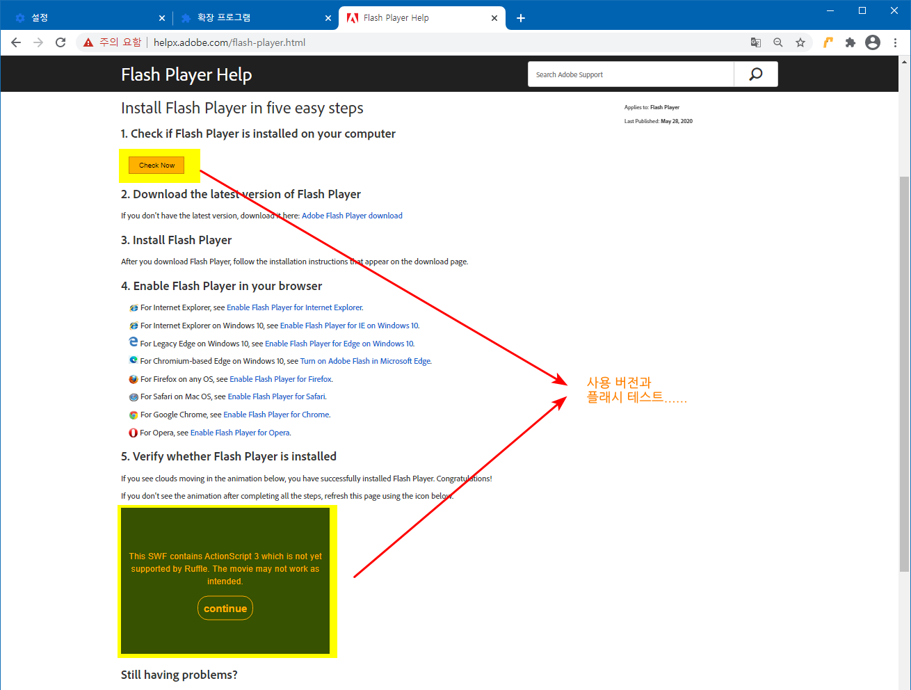 설치용 또는 포터블용 버전에 상관없이 크롬 브라우저를 사용하면 이 부분은 크게 신경쓰지않아도 됩니다. Flash 엔진이 필요한 사이트에 접속하면 크롬 브라우저가 자동으로 최신 버전의 엔진을 다운 받습니다.