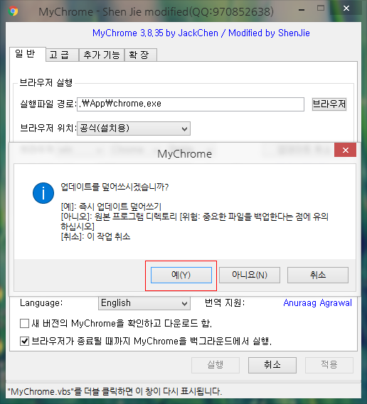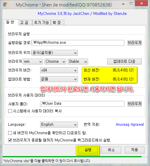 ※ 크롬의 업데이트는 "MyChrome.vbs" 파일을 더블클릭하여 마이크롬 설정화면에서 브라우저에 대한 기본 셋팅후 "업데이트 다운" 버튼을 클릭하여 업데이트하시면 항상 최신 버전으로 사용할 수 있습니다.
