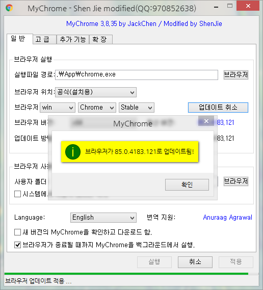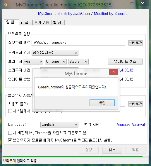 | ▶ MyChrome 프로그램 개발자 - MyChrome 최초 제작자 : https://github.com/cnjackchen/my-chrome - MyChrome 업데이트 제작자 : https://github.com/xixiranran/MyChrome |