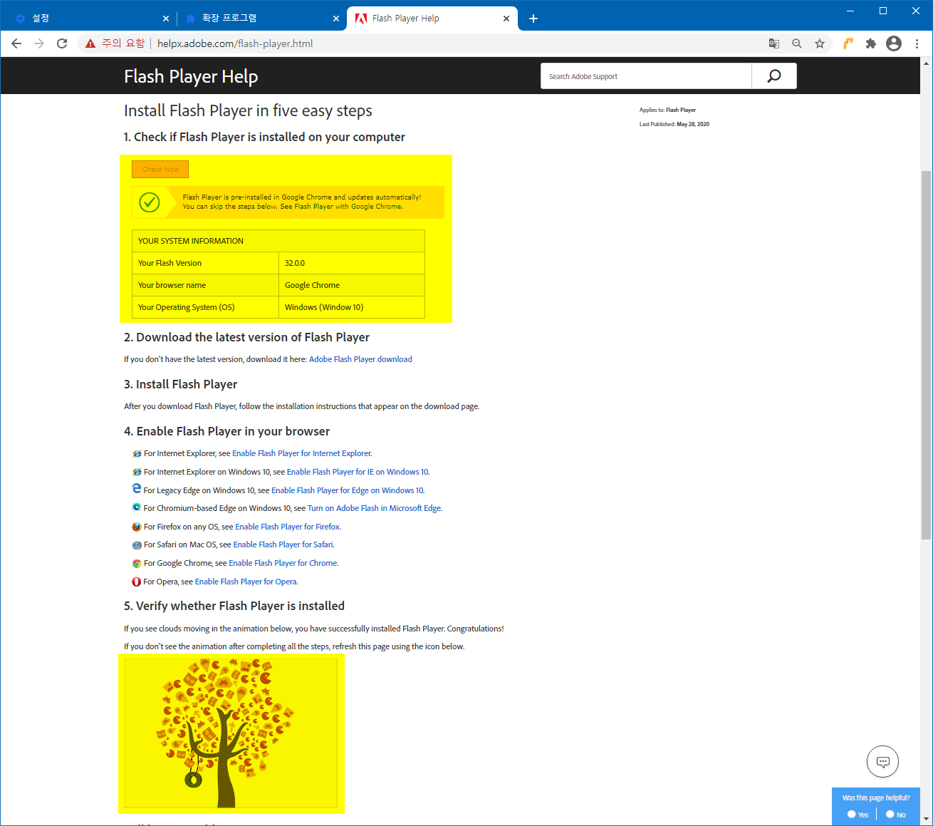 Adobe Flash Player가 2020년 12월 31일로 보안업데이트 지원 종료하였고, 최종 버전이 32.0.0.465 입니다. 그래서 최종 버전을 기준으로 종료 기간을 2040년까지 연기된 패치 버전으로 교체했습니다.