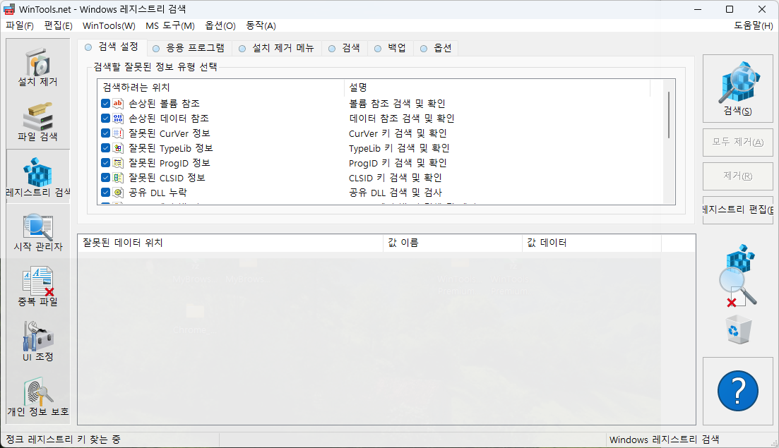보통 프로그램은 설치될 때 Windows 레지스트리를 사용하여 설정을 저장하고, 새 파일확장자를 추가하여 구성요소를 마무리합니다. 그러나 프로그램을 제거할 때는 해당 프로그램에 대한 기록이 삭제되지 않고 레지스트리에 남게 됩니다. 설치와 제거를 빈번하게 하면 Windows 불필요한 레지스트리가 점점 더 많아져 컴퓨터 성능 및 프로그램이 레지스트리를 읽은 속도가 늦어지게 됩니다. 레지스트리 검사 도구는 레지스트리를 주기적으로 정리하고 잘못된 항목을 수정하도록 설계되었습니다. - 시작 프로그램