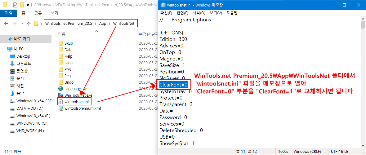 WinTools.net Premium_20.5\App\WinToolsNet 폴더에서 "wintoolsnet.ini" 파일을 메모장으로 열어 "ClearFont=0" 부분을 "ClearFont=1"로 교체하시면 됩니다.