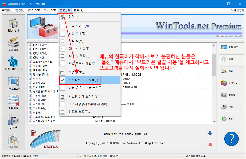WinTools.net 프로그램을 실행한 다음, 상단의 옵션 메뉴에서 "부드러운 글꼴 사용"을 체크하여 재 실행하시면 됩니다. 원래 체크된 상태가 기본인데 한국어 메뉴가 잘려서 이 부분을 체크 해제 하였습니다.