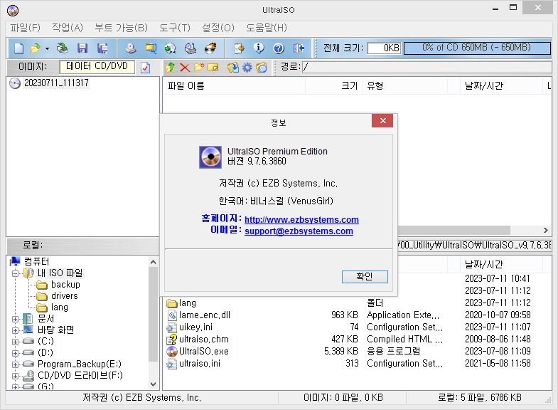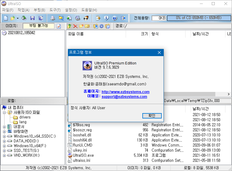 - 관리자권한으로 실행되며, ISO 및 기타 파일을 프로그램 인터페이스에 직접 드래그하거나 두 번 클릭하여 열 수 있음.