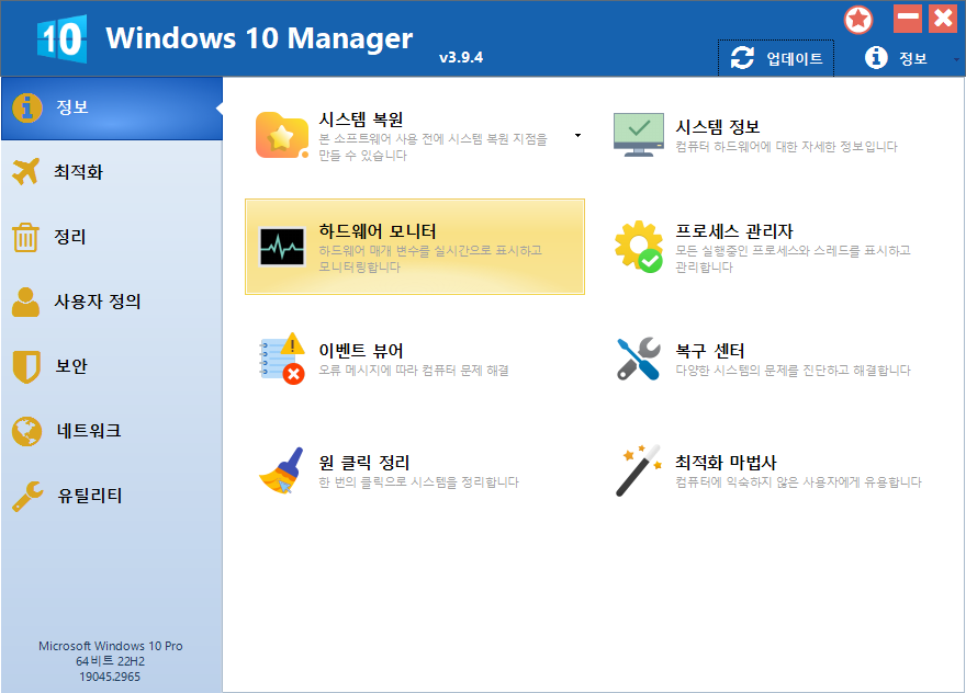 | 정보 | 시스템 복원, 하드웨어 정보 보기, 하드웨어(센서) 모니터링, 실행 중인 프로세스 관리, 시스템 문제 복구, 원 클릭 클리너, 최적화 마법사 |