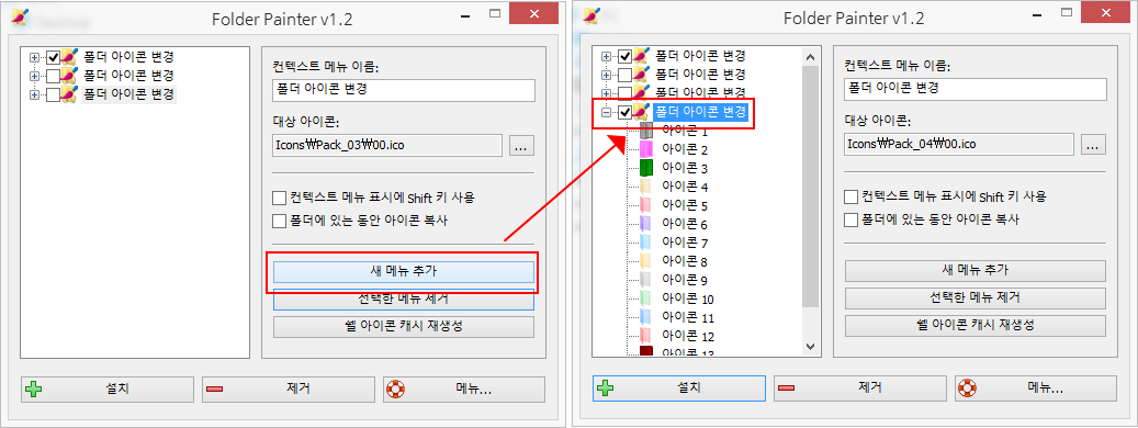FolderPainter.exe(또는 FolderPainter_x64.exe)로 실행하여 메인화면 왼쪽에 있는 3 가지 폴더 아이콘팩에서 원하는 아이콘팩을 선택한 다음, "설치" 버튼을 클릭하여 마우스 우클릭 메뉴에 추가하여 사용하시면 됩니다.