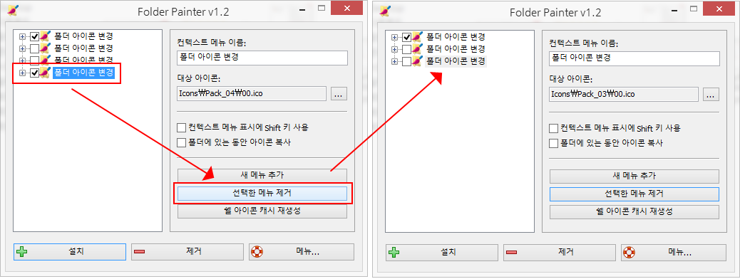 - 선택한 메뉴 제거 : 선택한 폴더 아이콘 팩 메뉴를 왼쪽 목록에서 삭제