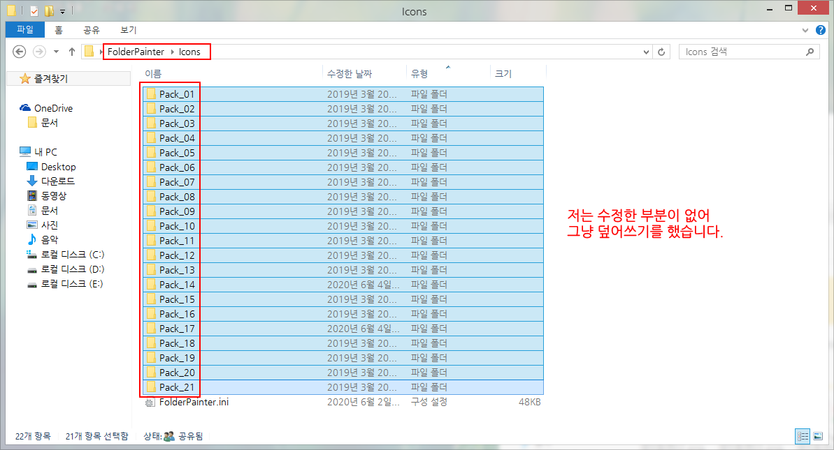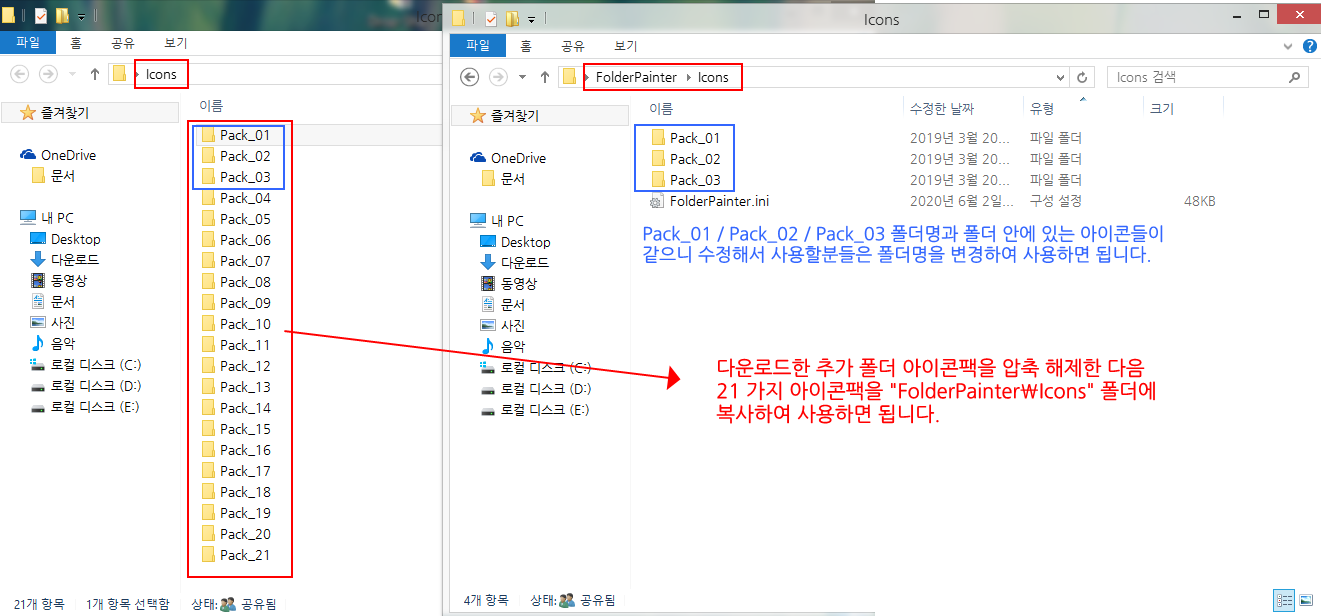| 기본 제공되는 3 가지 아이콘팩 폴더명과 추가 다운로드한 아이콘팩 폴더명이 동일하고, 아이콘팩 폴더 안에 포함된 아이콘들도 같습니다. 사용자가 수정한 부분이 없으면 그냥 덮어쓰기를 하여 사용해도 상관없으나, 수정한 부분이 있으면 추가할 "Pack_01, Pack_02, Pack_03" 폴더 이름을 변경하여 추가하시면 됩니다. |