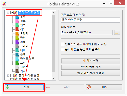 - 폴더 아이콘팩 추가, 삭제목록명, 추가 또는 삭제 작업을 마무리한 다음, "설치" 버튼을 클릭하여 사용하시면 됩니다.