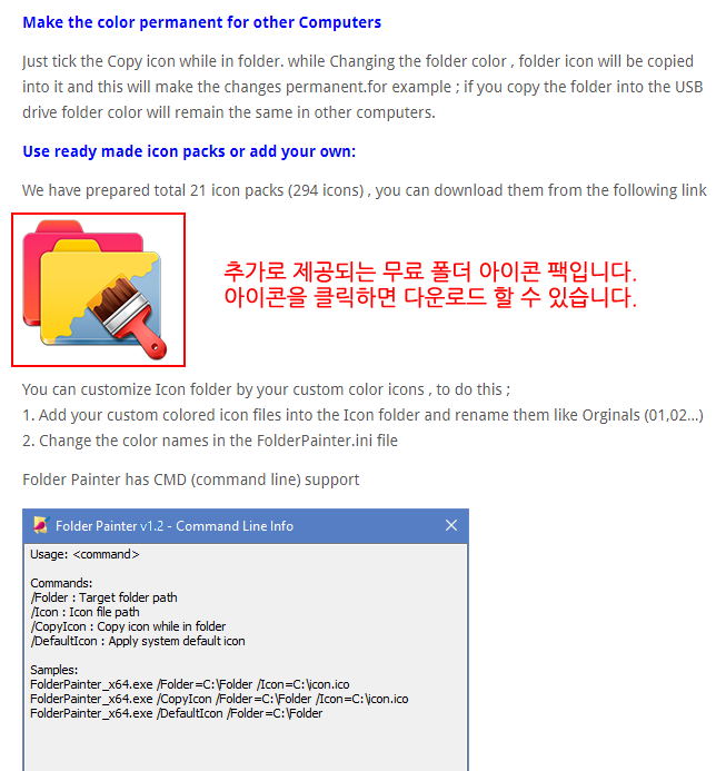Folder Painter는 기본 3 가지 폴더 아이콘팩(14가지 색상이 있음)을 제공되며, 홈페이지에서 제공되는 무료 추가 아이콘팩(FolderPainter_Icons.zip)까지 총 21 가지 폴더 아이콘팩을 사용할 수 있습니다.