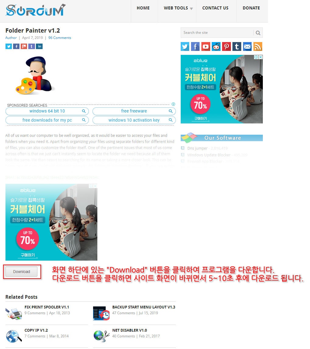 다운로드 홈페이지에 접속하면 화면 아래쪽 광고 바로 밑에 "Download" 아이콘이 보이는데, 이 다운로드 아이콘을 클릭하면 프로그램을 다운로드 할 수 있습니다. 클릭 후 바로 다음 페이지로 전환되면서 다운로드가 진행되는데 사용자 환경에 따라 5~10초 사이에 다운로드 창이 활성화됩니다. 그리고 추가로 제공되는 폴더 아이콘팩도 밑에 스샷 이미지를 참조하여 다운로드합니다.