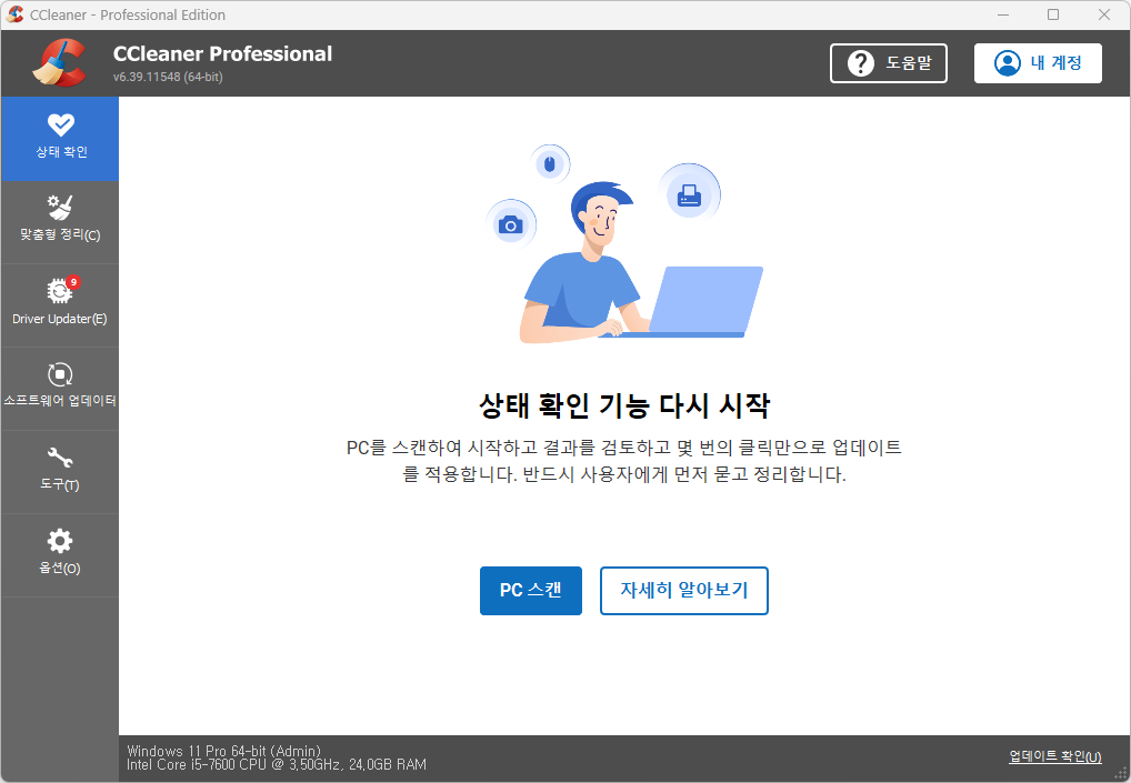Windows를 청소하는 올인원 청소 도구입니다. 불필요한 데이터 및 레지스트리, 시작 프로그램 등을 깨끗히 제거하여 Windows 속도를 높이고, 오류 및 충돌의 원인이 되는 레지스트리를 복구할 수 있습니다. 기록 파일 및 행동을 추적하는 쿠키를 삭제하여 개인 프라이버시도 보호합니다.