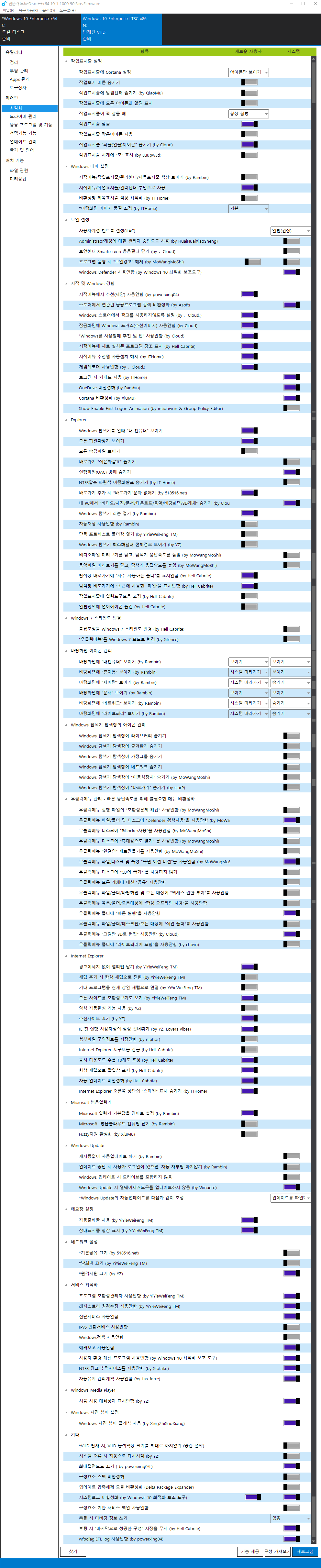 제작자 윈도우는 순정 윈도우에 기능만 트윅한 에디션과 라이트 에디션으로 구별됩니다.