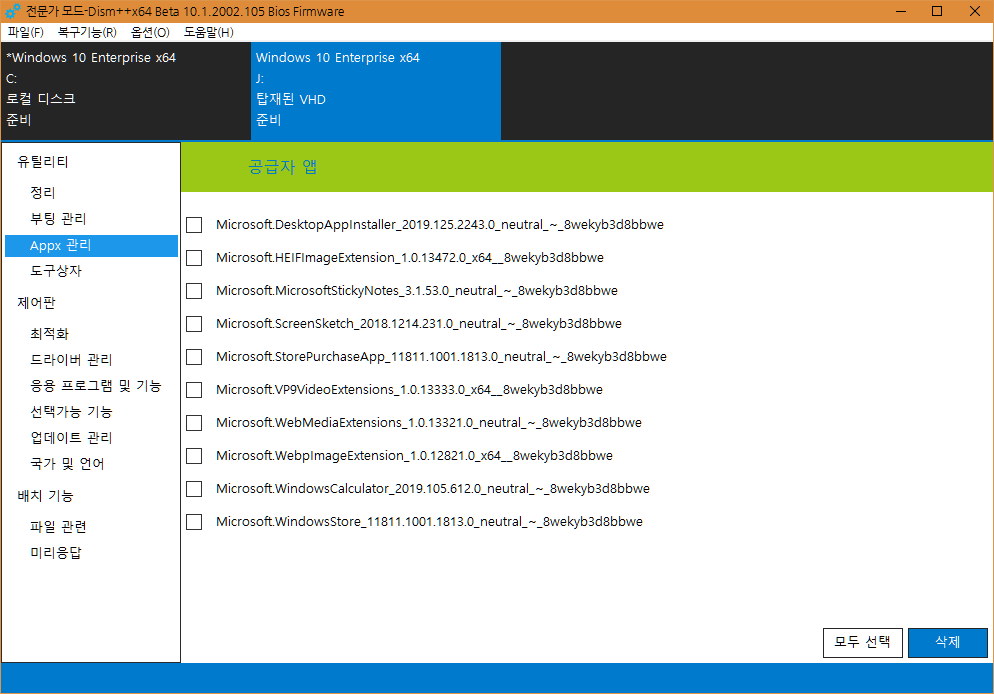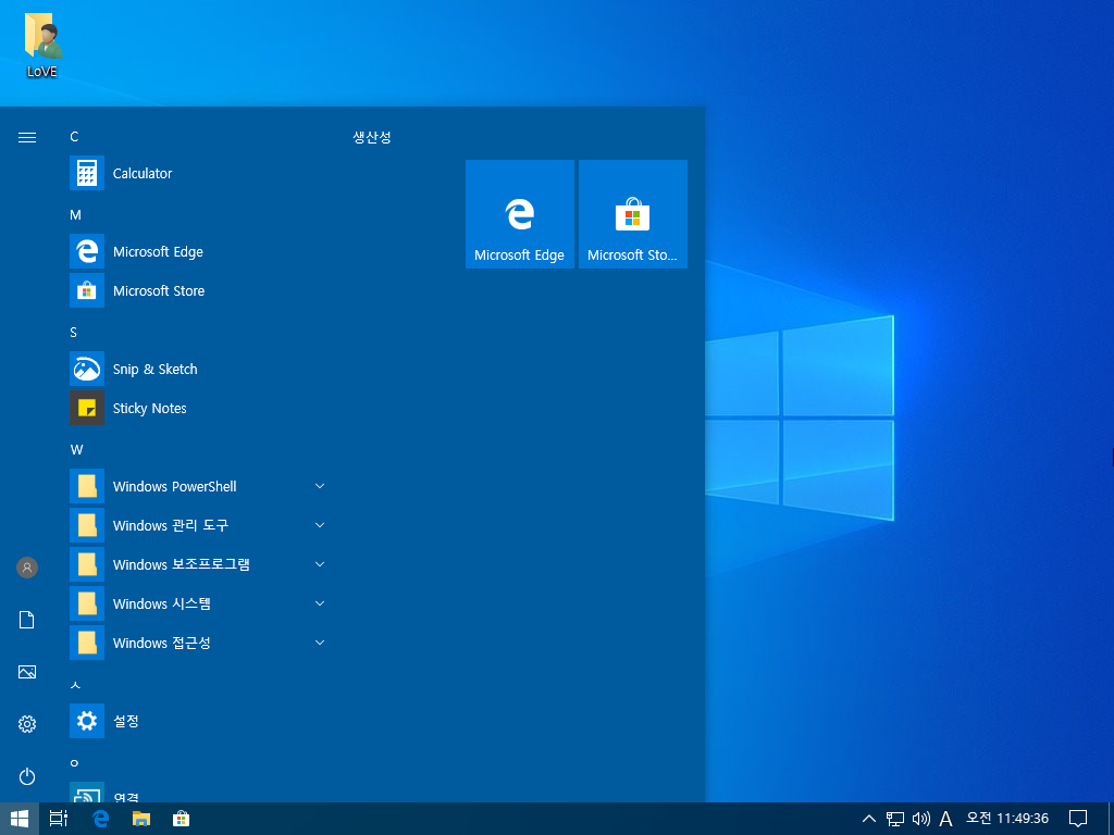 - 대부분의 앱 삭제(스토어/계산기/Sticky Notes/Snip & Sketch 제외)