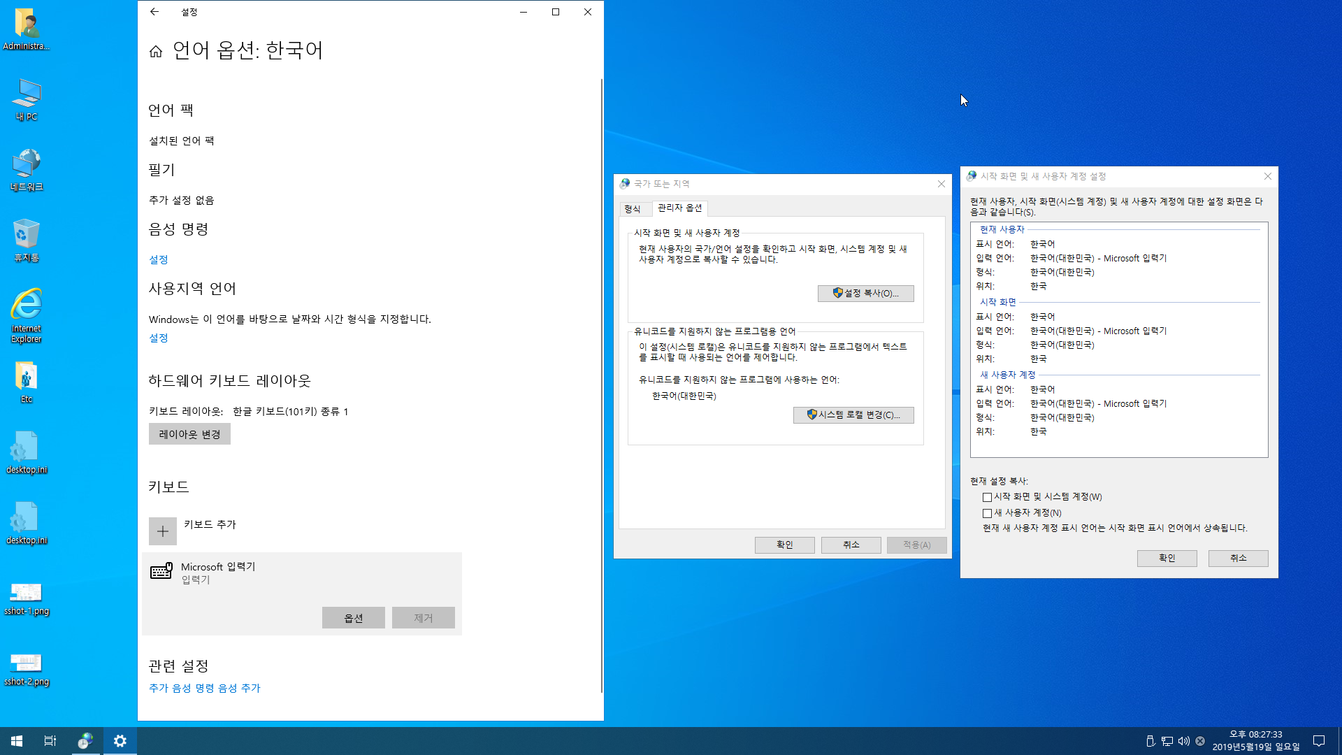 기존에 공부한 레지를 가지고 적용해 보고 또 새롭게 한국어 순정 윈도우에서 추출하여 적용해도 수정이 안되어