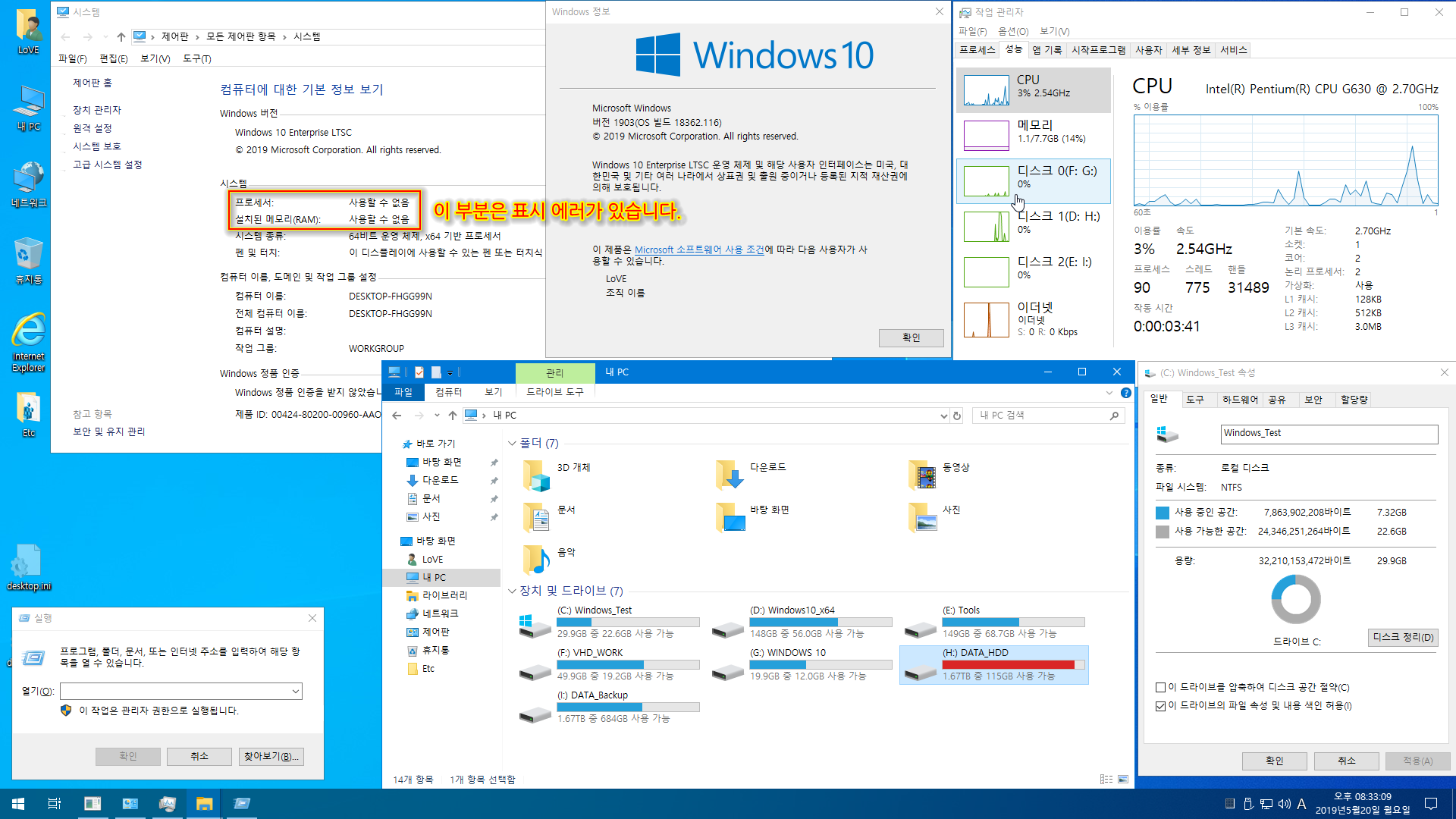 "내 PC"의 속성 부분에서 "프로세서/메모리"가 표시가 안되는 에러도 있습니다.