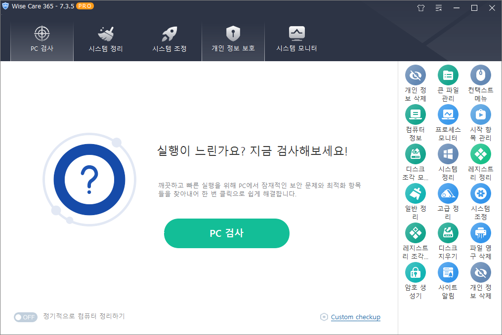 Wise Care 365는 PC를 청소하고 관리하는데 필요한 모든 기능을 갖춘 종합 최적화 프로그램입니다. 특히, 정리 및 튜닝 기능은 그 동안의 노하우가 있기 때문에 안전하게 파일이나 레지스트리를 삭제하여 PC 성능을 향상 시길 수 있습니다.