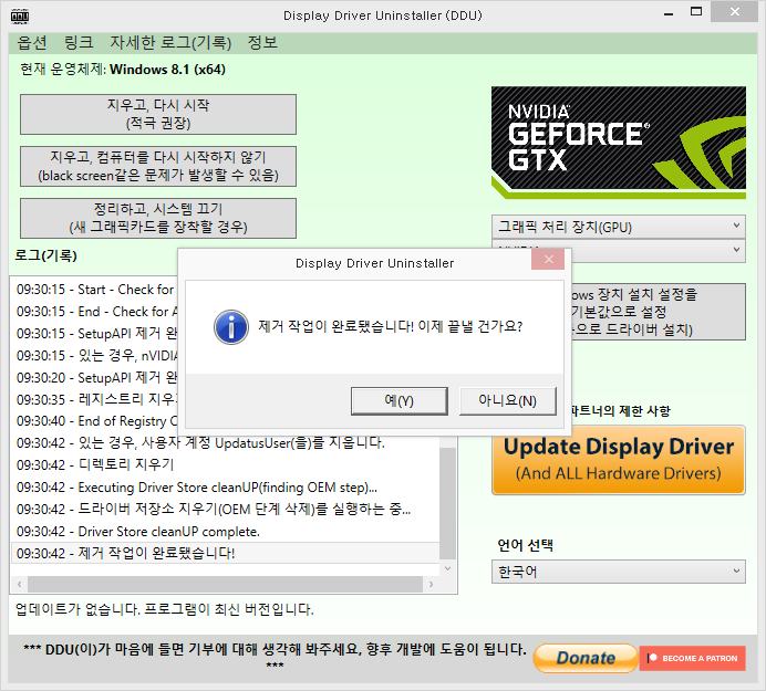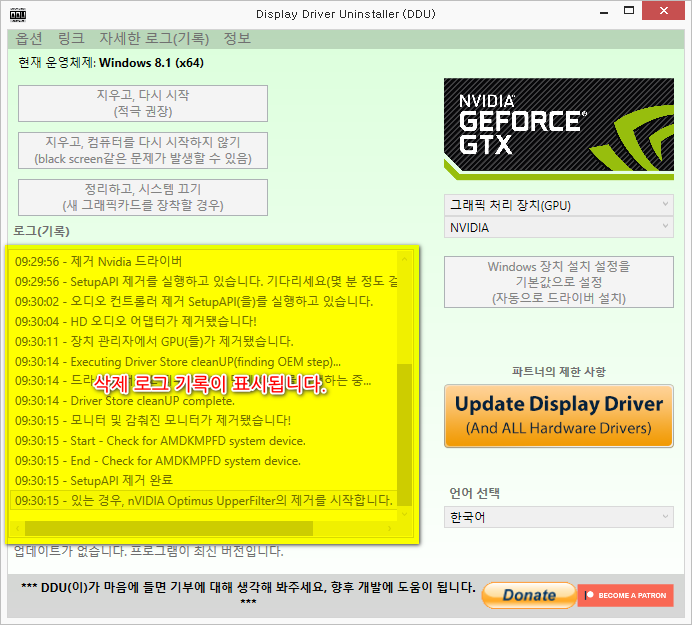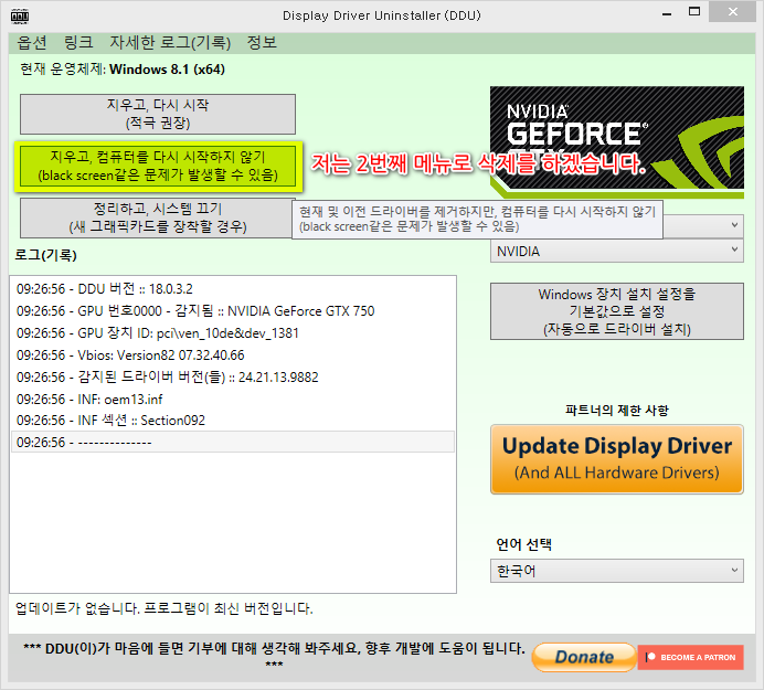 - 지우고, 컴퓨터를 다시 시작하지 않기 : 드라이버를 삭제하지만 컴퓨터를 재부팅하지 않습니다. 다중 GPU가 장착된 컴퓨터에서 드라이버 삭제 및 GPU를 변경하고자할 때 사용합니다.