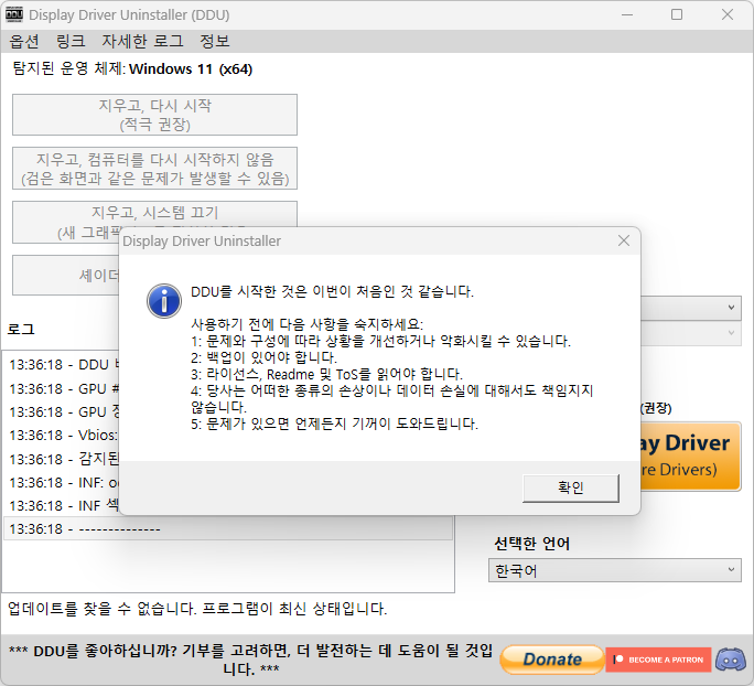 - 처음 대화상자는 DDU 사용상 주의사항이며, "확인" 버튼을 클릭하여 다음으로 진행합니다.