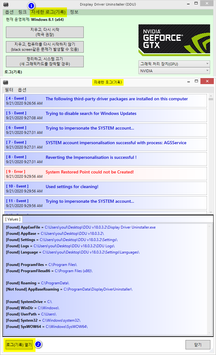 - 왼쪽 아래에 '로그(기록) 열기' 버튼을 클릭해 'DDU Logs' 폴더 안에 있는 로그 파일을 선택하면, 로그를 볼 수 있습니다.