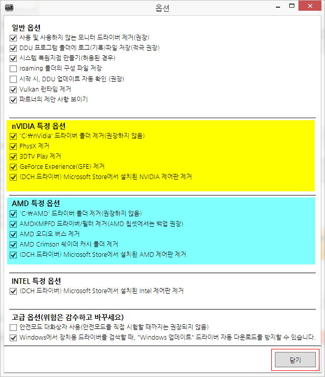 DDU 옵션에는 NVIDIA와 AMD에 관련된 특정 옵션이 있어, 삭제하고 싶은 드라이버나 패키지를 선택할 수 있습니다.