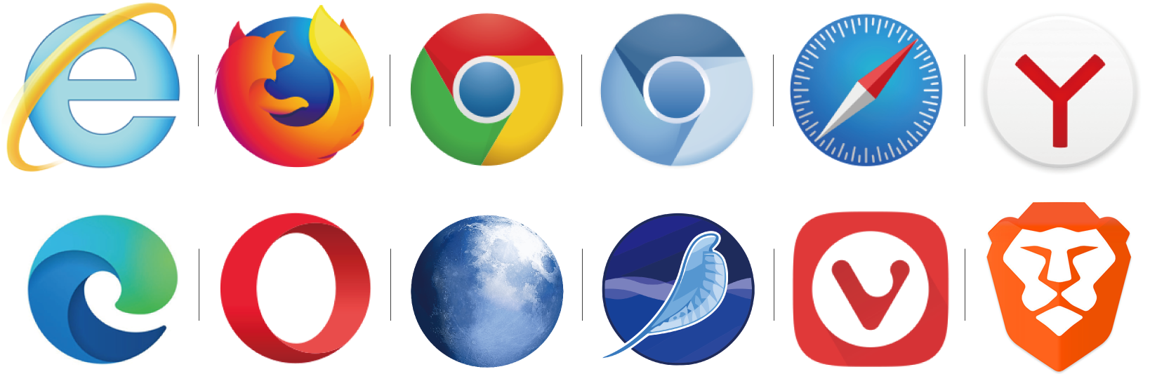 | Internet Explorer・Mozilla Firefox・Google Chrome・Chrome Canary・Safari・Yandex Edge・Opera・Pale Moon・MozillaSeaMonkey・Vivaldi・Brave |