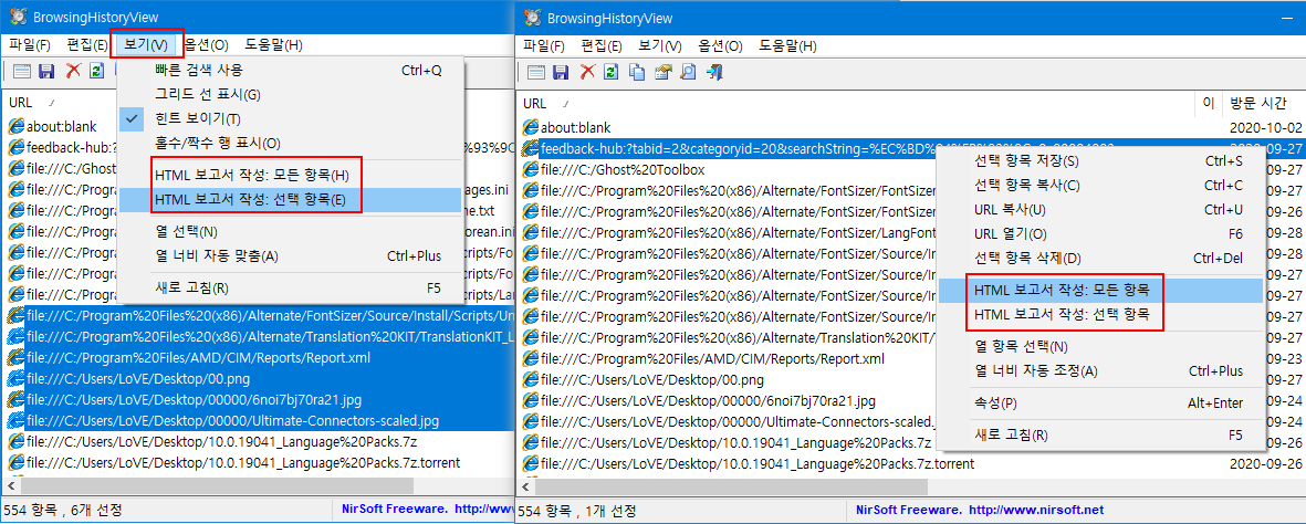 보기 메뉴 또는 마우스 우클릭 메뉴에서 'HTML 보고서 작성: 모든 항목' 또는 'HTML 보고서 작성: 선택 항목'을 선택하면 브라우저에 HMTL 보고서를 표시합니다.
