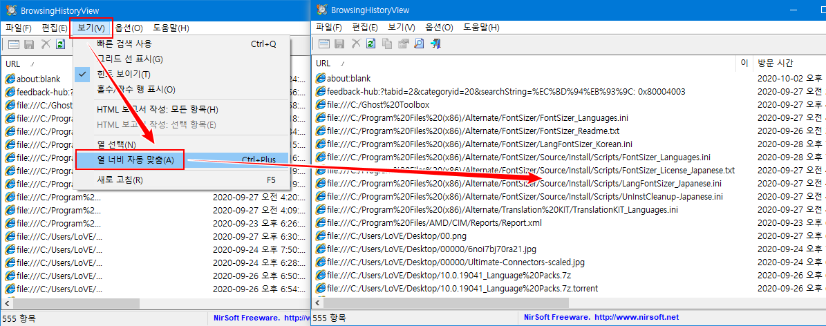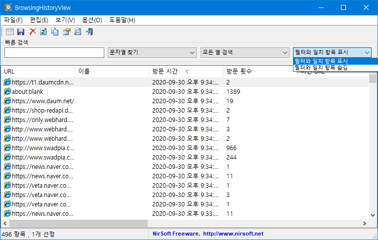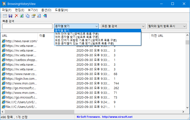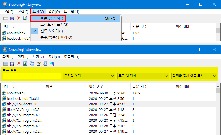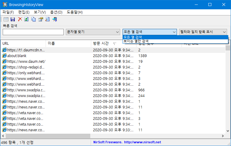 • 보이는 열만 검색 : 화면에 보이는 '열'만 검색. 예를 들어 캡처 이미지에서 보이는 'URL, 이름, 방문 시간, 방문 횟수, 이전 URL'에서만 검색을 한다는 의미.