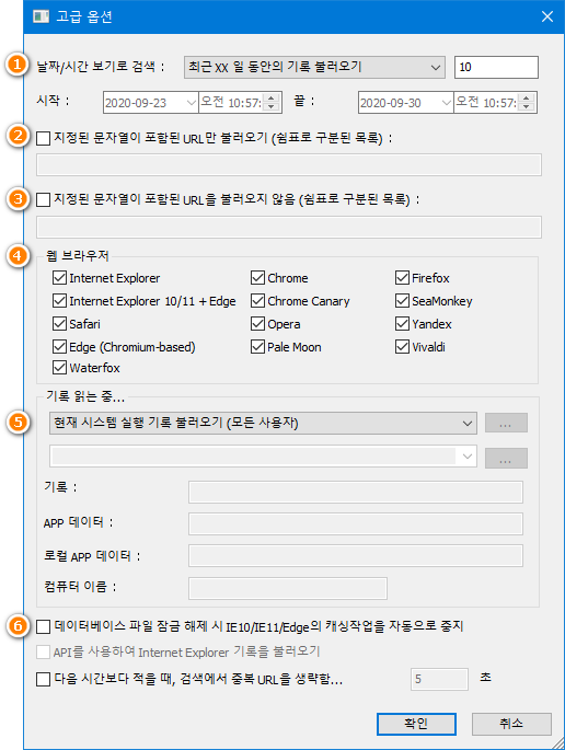 - 지정된 기록 파일에서 기록 불러오기 : 웹 브라우저의 기록 파일(경로명)을 지정