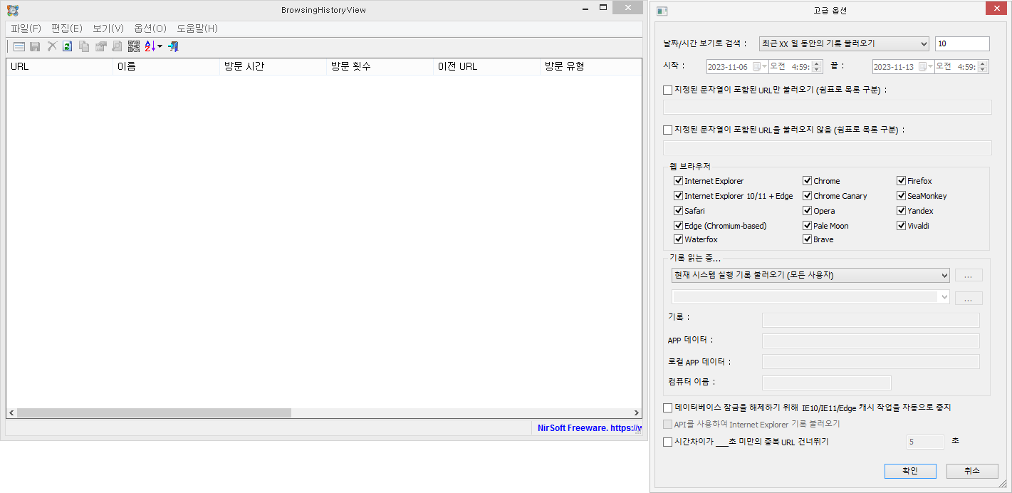 프로그램을 시작할 때 '고급 설정' 메뉴가 열리며, 기록을 가져올 조건을 설정할 수 있습니다. 기본 설정은 브라우저 '지난 10일 동안의 기록 불러오기'와 '현재 시스템 실행 기록 불러오기(모든 사용자)'로 설정되어 있으니 필요한 부분을 본인에 맞게 변경하는 것이 좋습니다.