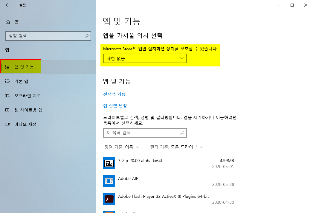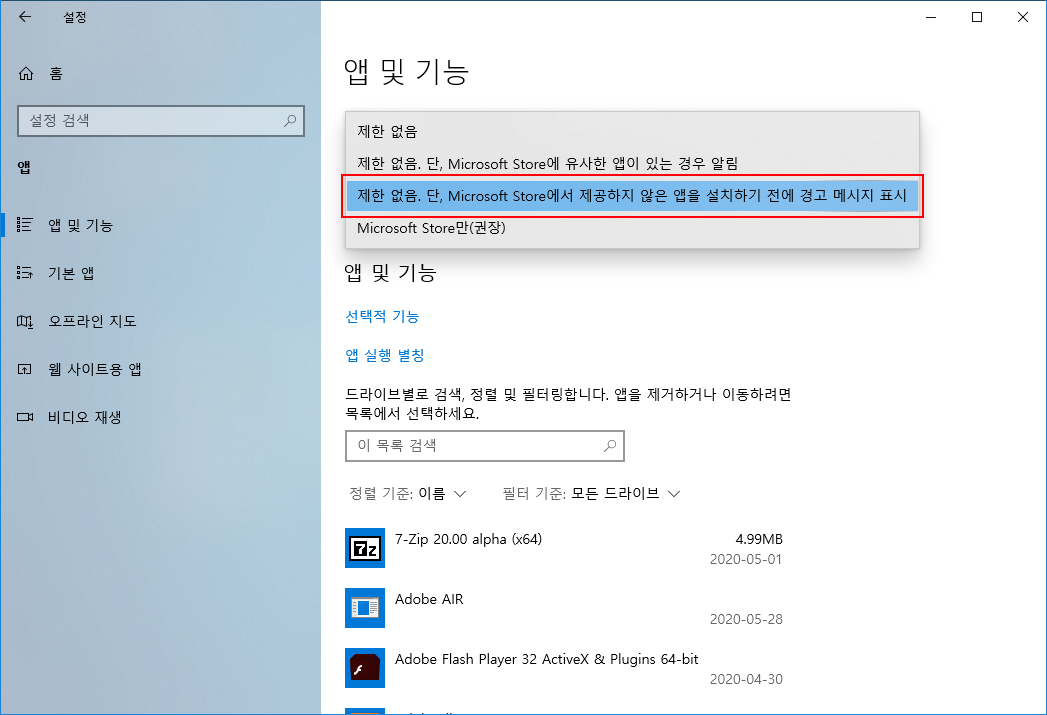 ※ 'Microsoft Store만(권장)' 항목으로 선택한 경우에는 스토어에서 다운로드하지 않는 모든 응용 프로그램의 설치를 할 수 없게 됩니다.