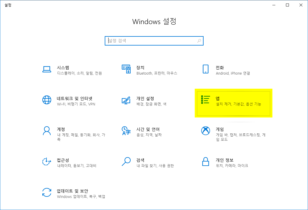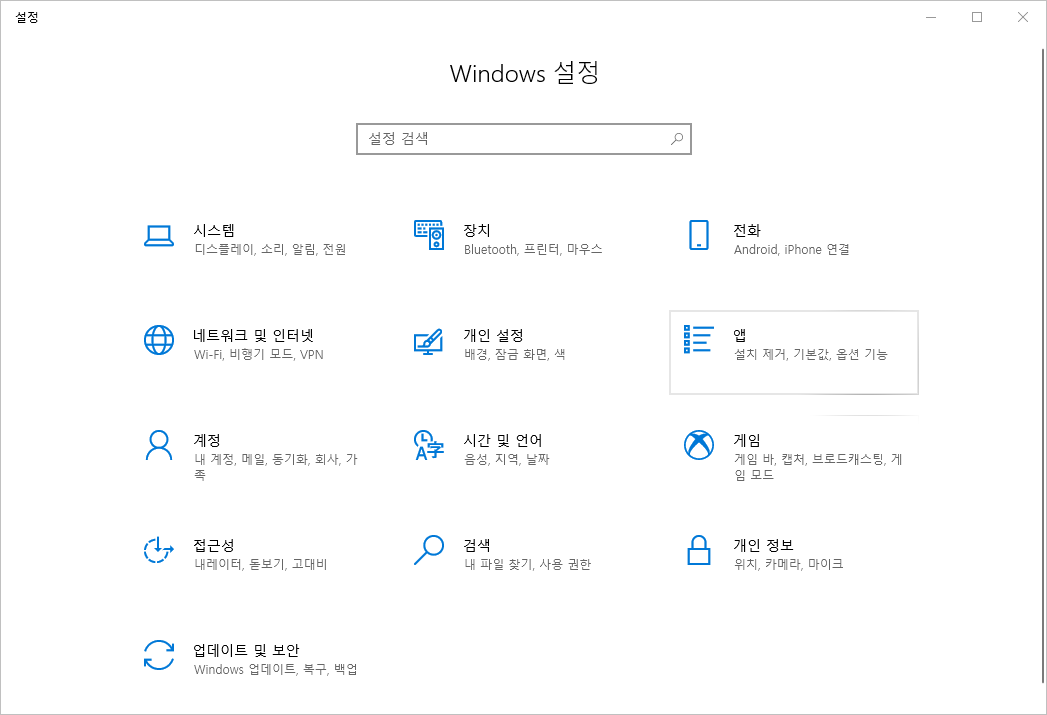 ② Windows 10 설정 창의 메뉴 중 '앱' 메뉴를 선택합니다.