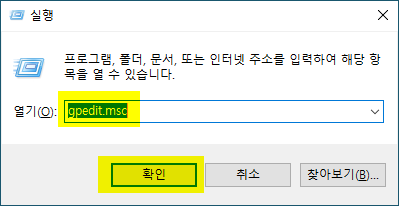- 설치 완료 후 '윈도우 키 + R' 눌러 명령 실행 창에 'gpedit.msc' 입력하여 '로컬 그룹 정책 편집기'를 실행하여 사용