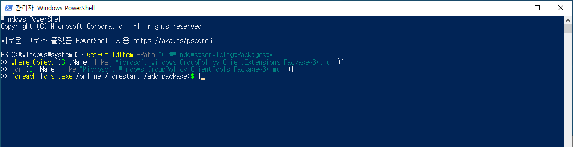 Get-ChildItem -Path "C:\Windows\servicing\Packages\*" | Where-Object{($_.Name -like "Microsoft-Windows-GroupPolicy-ClientExtensions-Package~3*.mum")` -or ($_.Name -like "Microsoft-Windows-GroupPolicy-ClientTools-Package~3*.mum")} | foreach {dism.exe /online /norestart /add-package:$_} |