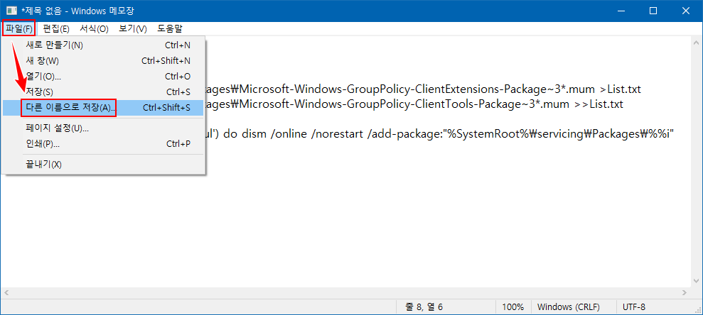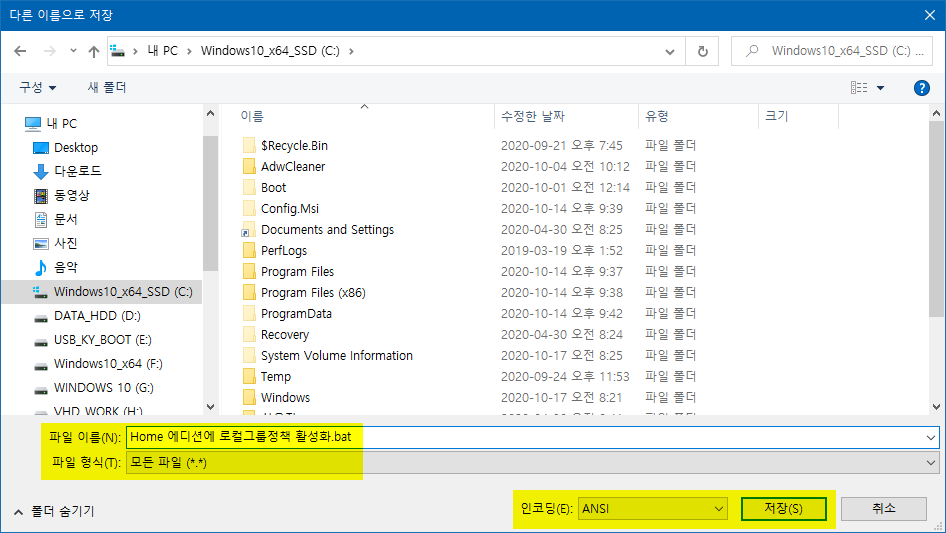 - '파일 → 다른 이름으로 저장 → **********.bat' 확장자로 파일명을 주고, 파일형식은 '모든 파일' 선택, 인코팅은 'ANSI' 선택하여 저장
