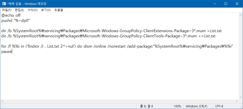 | @echo off pushd "%~dp0" dir /b %SystemRoot%\servicing\Packages\Microsoft-Windows-GroupPolicy-ClientExtensions-Package~3*.mum >List.txt dir /b %SystemRoot%\servicing\Packages\Microsoft-Windows-GroupPolicy-ClientTools-Package~3*.mum >>List.txt for /f %%i in ('findstr /i . List.txt 2^>nul') do dism /online /norestart /add-package:"%SystemRoot%\servicing\Packages\%%i" pause |