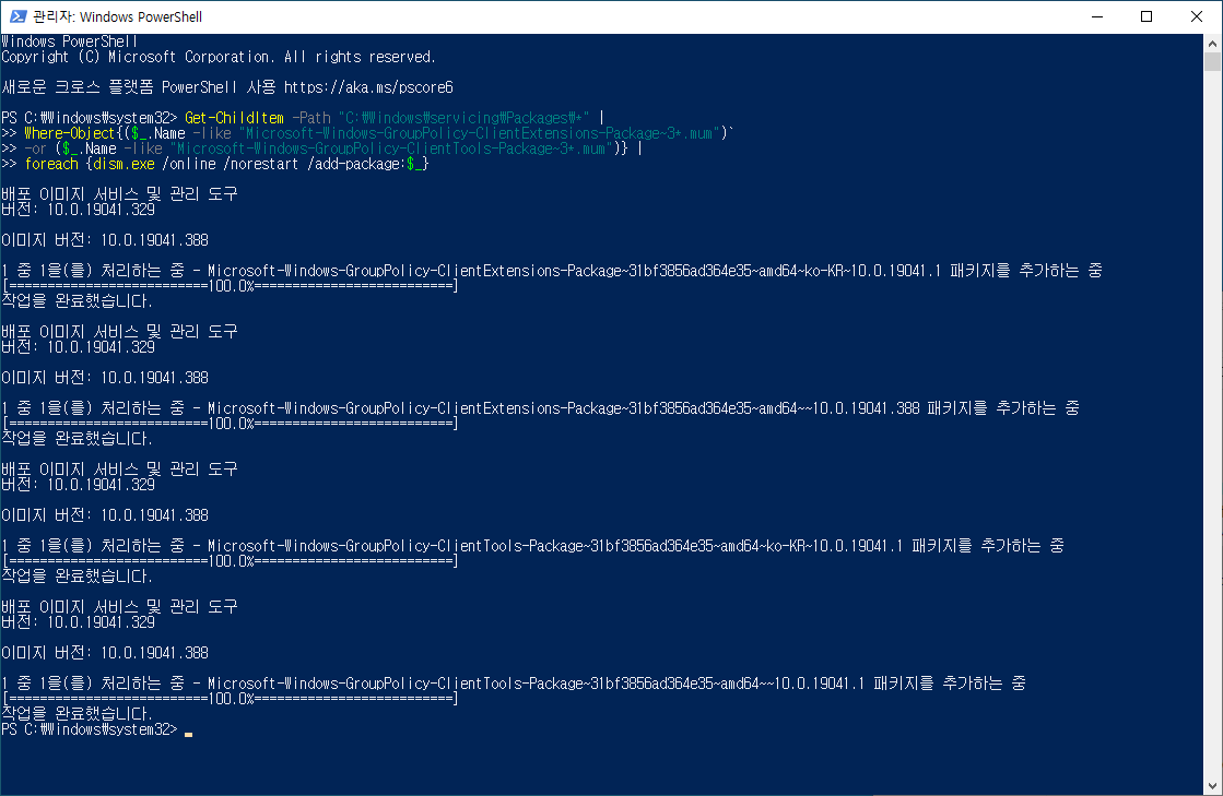 이상으로 Widnows 10 Home 버전에 '로컬 그룹 정책 편집기'를 활성화는 방법에 대해 정리했습니다. 활성화할 때 CMD 방식으로 먼저 활성화해보고, 에러가 나오면 파워셸(PowerShell) 명령어로 하시면 됩니다.