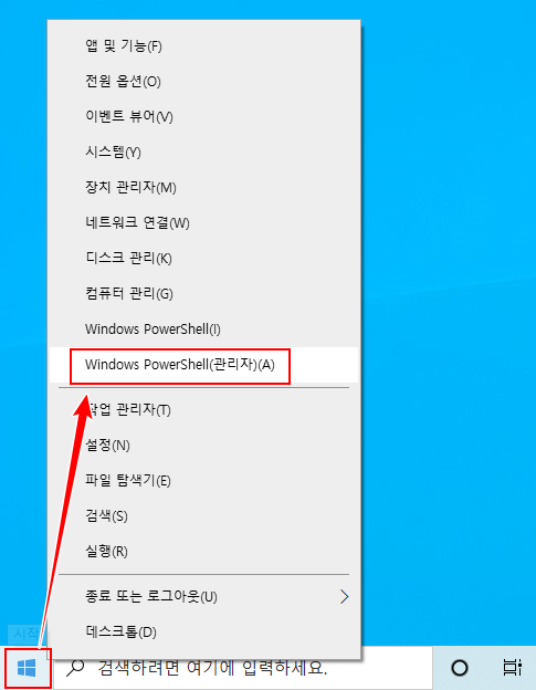 - '시작 메뉴' 아이콘을 마우스 오른쪽 버튼으로 클릭한 다음, 메뉴 중 'Windows PowerShell(관리자)' 선택
