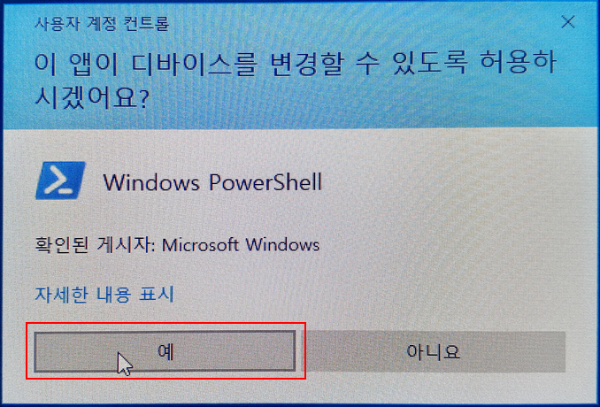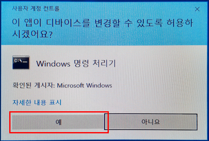 - 사용자 계정 컨트롤 창이 실행되면 '예' 버튼을 클릭