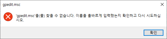 Widnows 10 Home 사용자가 바로 '실행' 창에 'gpedit.msc' 명령을 실행하면 아래 캡쳐 이미지처럼 '로컬 그룹 정책 편집기'를 실행할 수 없다는 경고 창이 나옵니다.