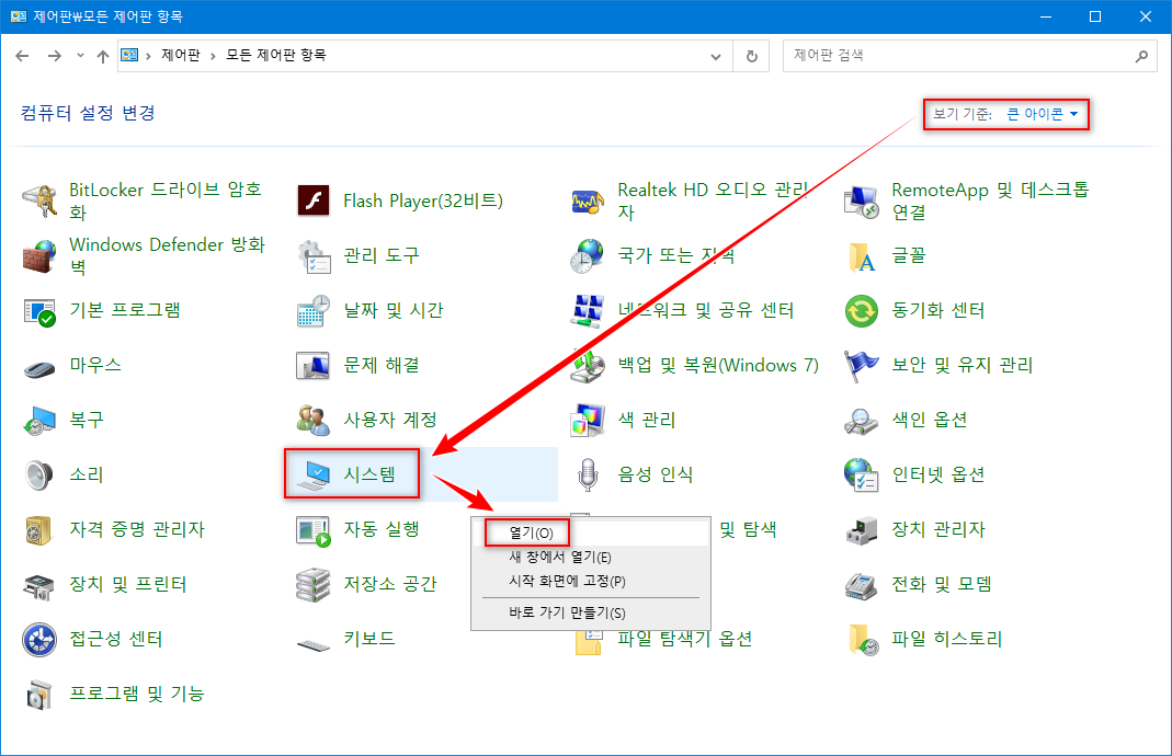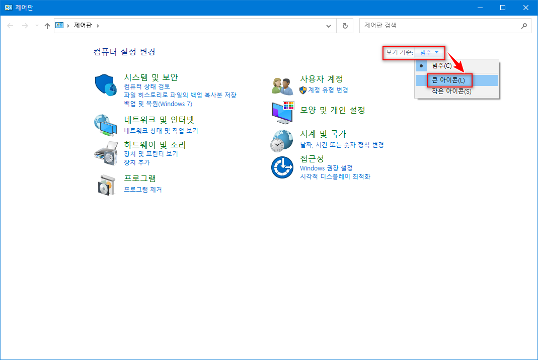 - 제어판의 '보기 기준'을 '큰 아이콘'으로 선택합니다.