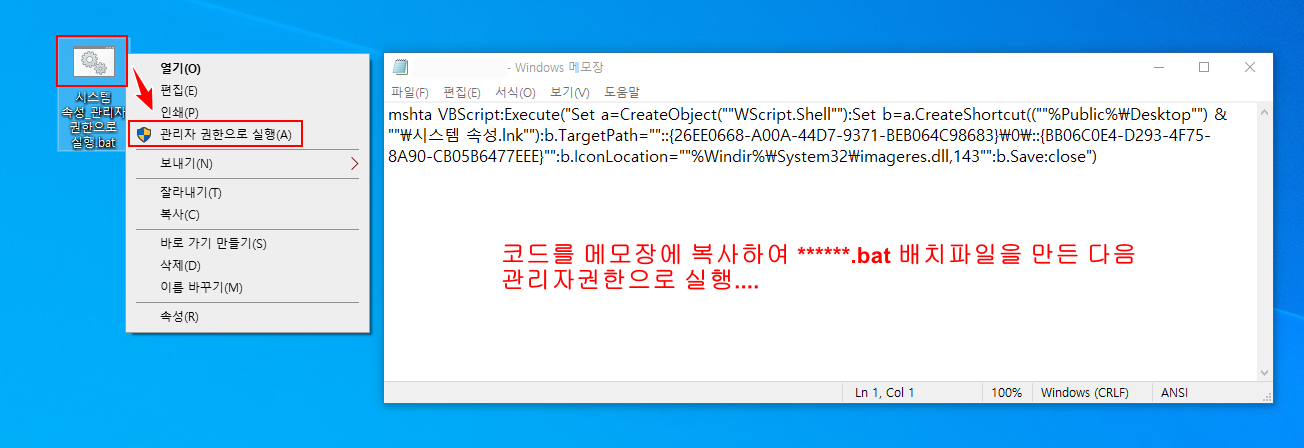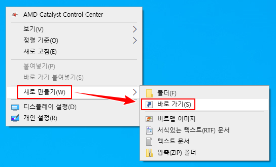 배치 명령어를 이용하여 바탕화면에 바로 가기를 만들어 이용하는 방법입니다. 이 방법도 모든 Windows에서 사용가능한 방법입니다.