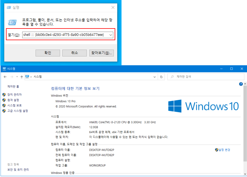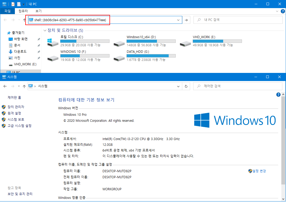 Windows 각 구성 요소에 대한 고유 식별 코드 CLSID 키(GUID)를 사용하는 방법입니다. 사용하는 Windows 10의 사용 환경에 따라 실행이 안될 수도 있습니다.