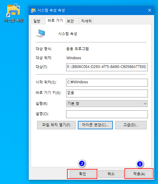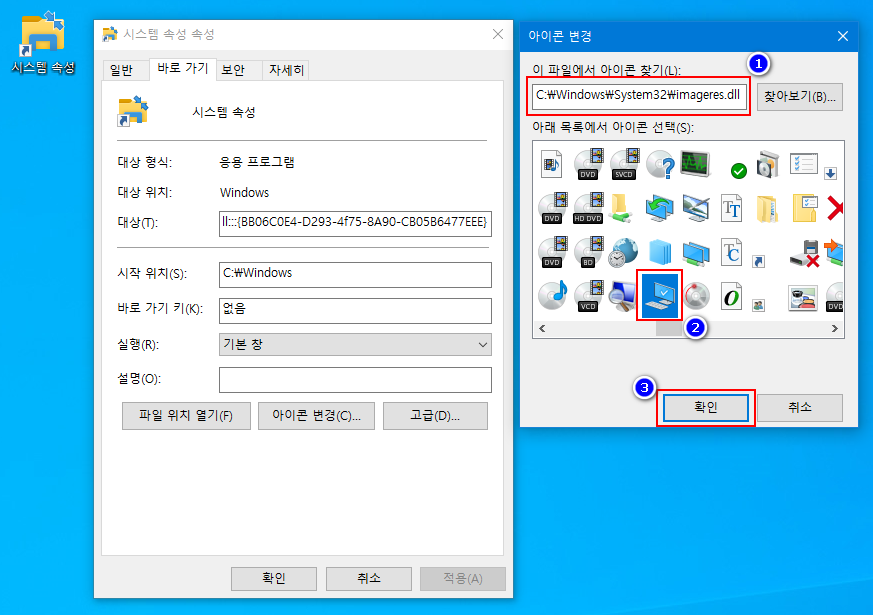 - 바로 가기가 생성되면 바로 가기 속성에서 아이콘 변경을 사용하여 원하는 모양으로 바꾸어 사용하시면 됩니다.