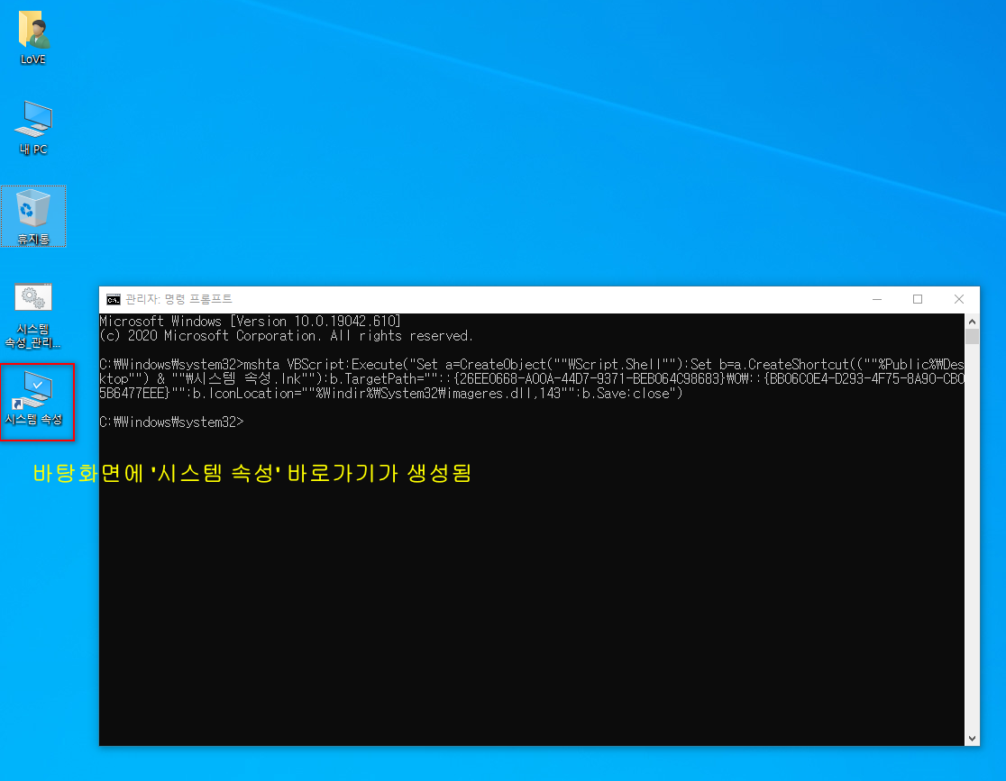 | mshta VBScript:Execute("Set a=CreateObject(""WScript.Shell""):Set b=a.CreateShortcut((""%Public%\Desktop"") & ""\시스템 속성.lnk""):b.TargetPath=""::{26EE0668-A00A-44D7-9371-BEB064C98683}\0\::{BB06C0E4-D293-4F75-8A90-CB05B6477EEE}"":b.IconLocation=""%Windir%\System32\imageres.dll,143"":b.Save:close") | |||||||||