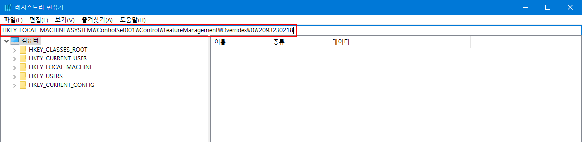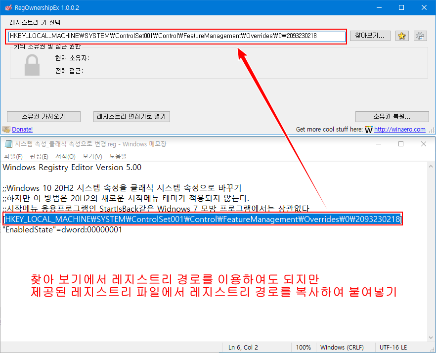 - 제공된 레지스티리 파일을 메모장으로 열어, RegOwnershipEx 프로그램의 '레지스트리 선택' 부분에 'HKEY_LOCAL_MACHINE\SYSTEM\ControlSet001\Control\FeatureManagement\Overrides\0\2093230218' 키를 복사한 다음, 붙여넣기를 합니다.