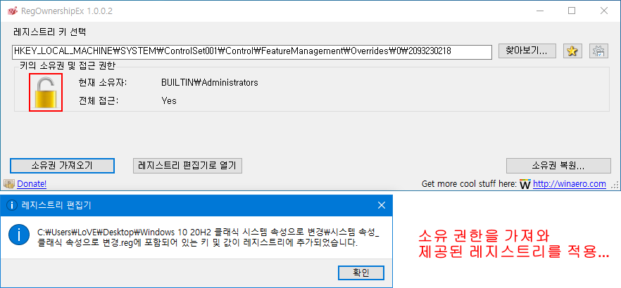 위 방법 7에서 제공된 레지스트리 파일을 'RegOwnershipEx 프로그램'을 사용하여 레지스트리 사용 권한을 변경한 다음, 수정할 레지스트리를 적용하는 방법입니다.