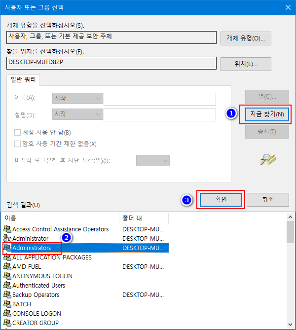 - Administrators 뒤에 있는 '(DESKTOP-MUTD82P\Administrators)' 이 부분은 설치된 윈도우에 따라 다르게 표시됩니다.