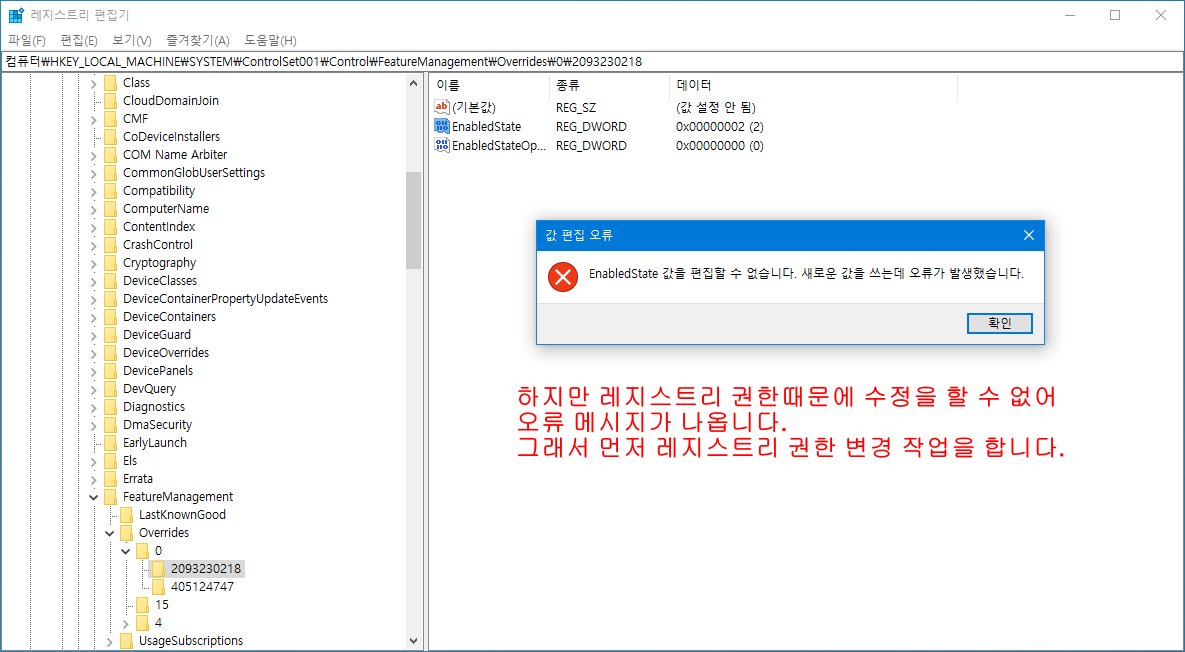 - 하지만 레지스트리 사용 권한때문에 수정을 할 수 없습니다.