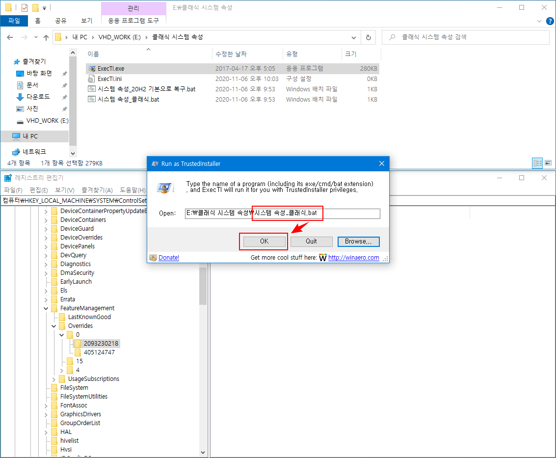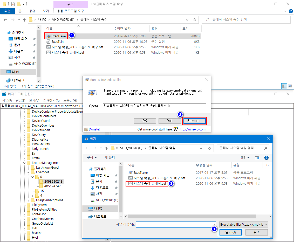 - 'ExecTl.exe 프로그램을 실행 → Browse... 버튼 클릭 → 시스템 속성_클래식 속성으로 변경.bat 파일 선택 → OK 버튼을 클릭하여 레지스트리 적용'